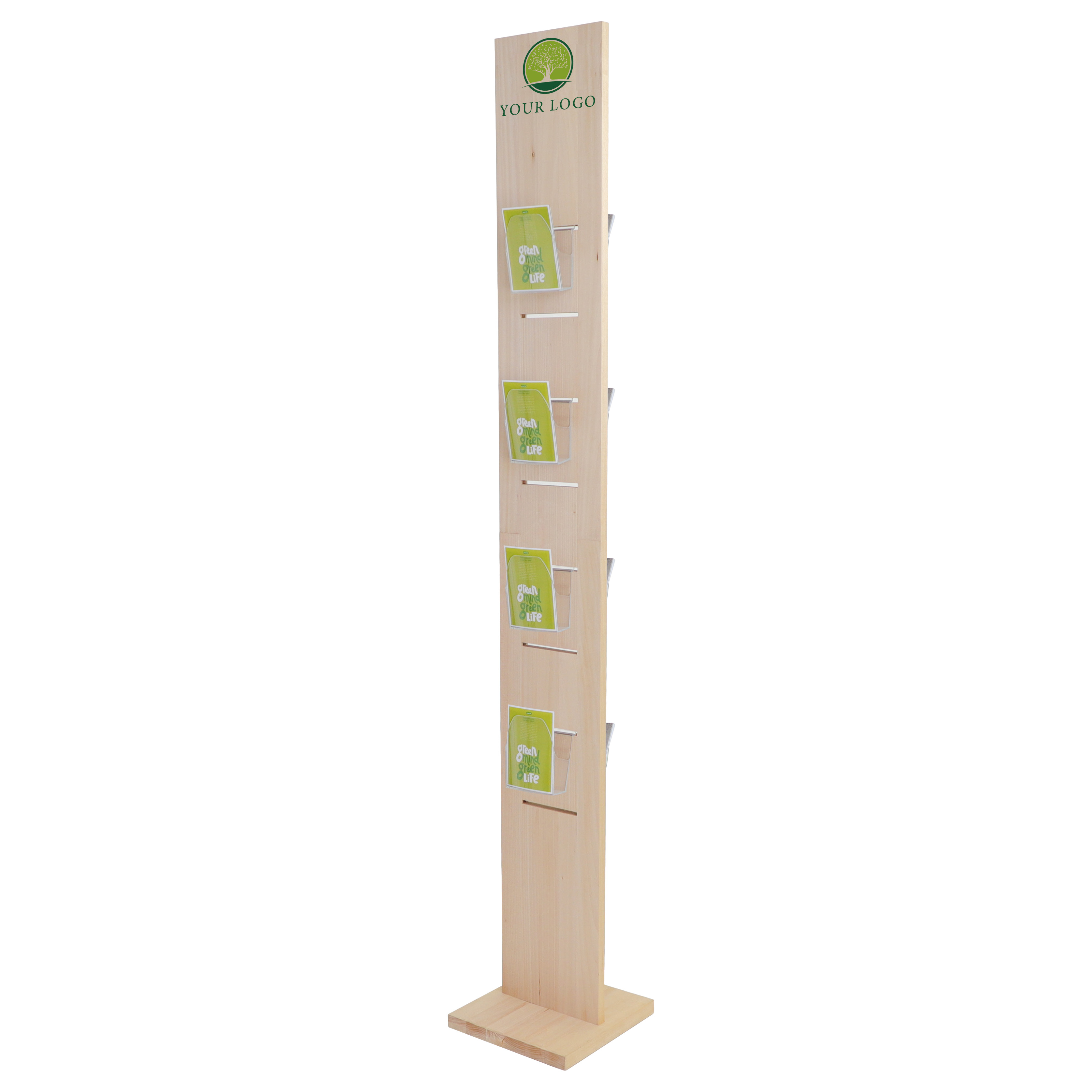 Wir bedrucken deinen Holz-Prospektständer ein- oder beidseitig mit deinem Layout im langlebigen Transferdruck.