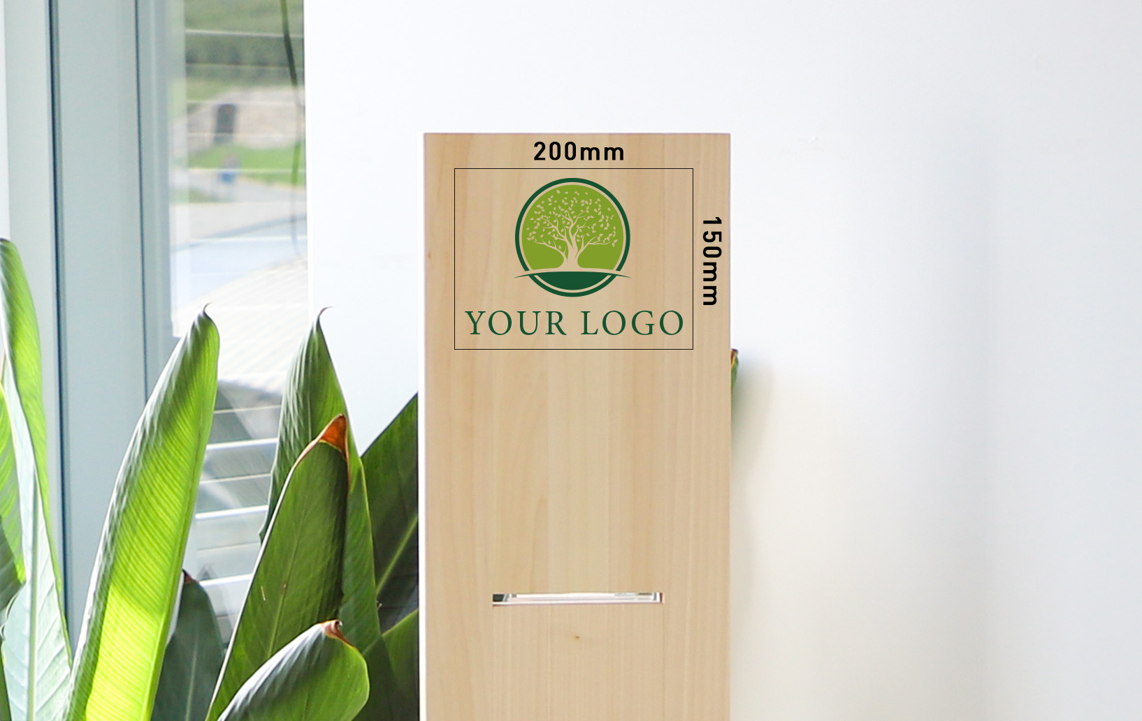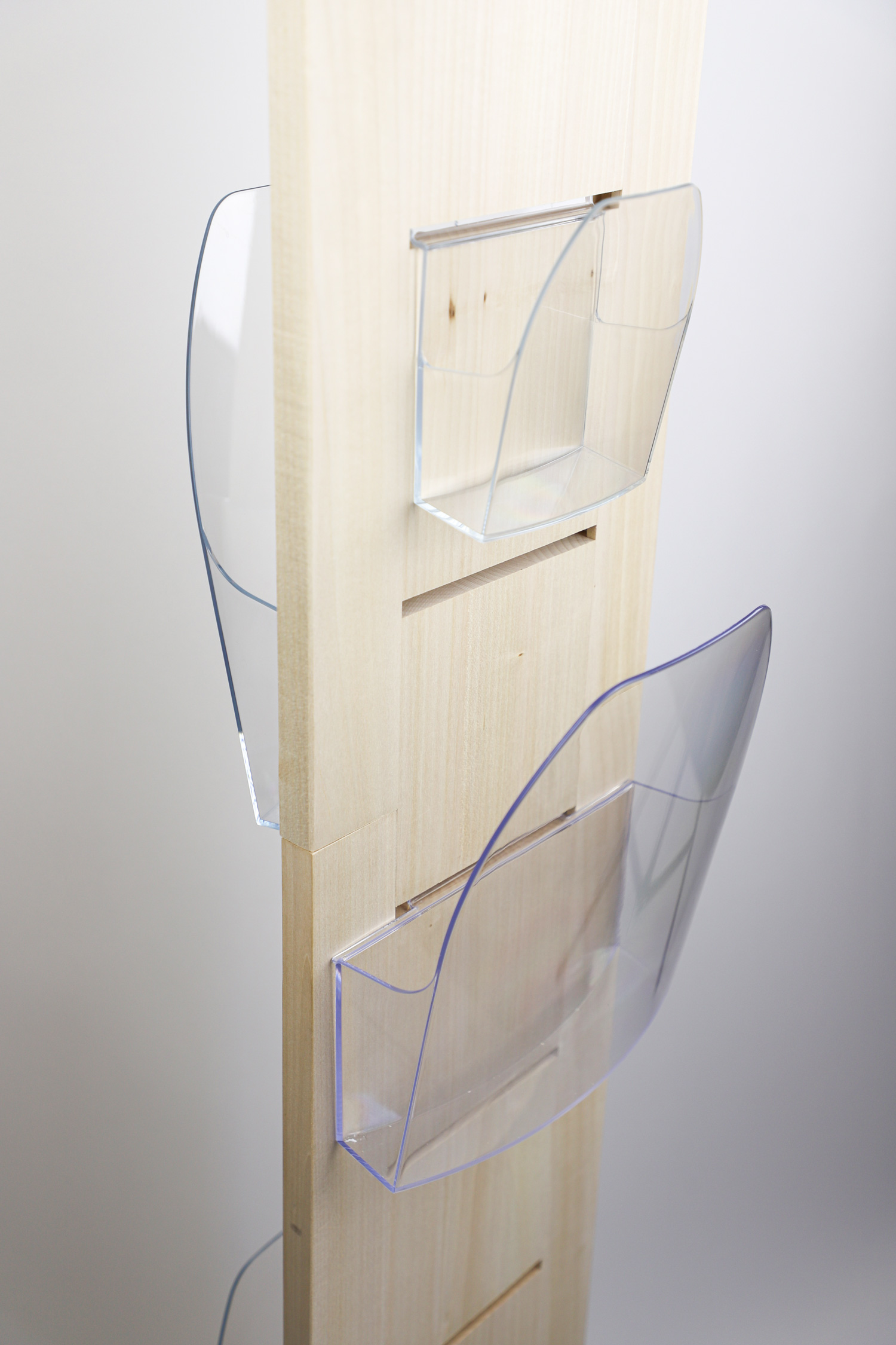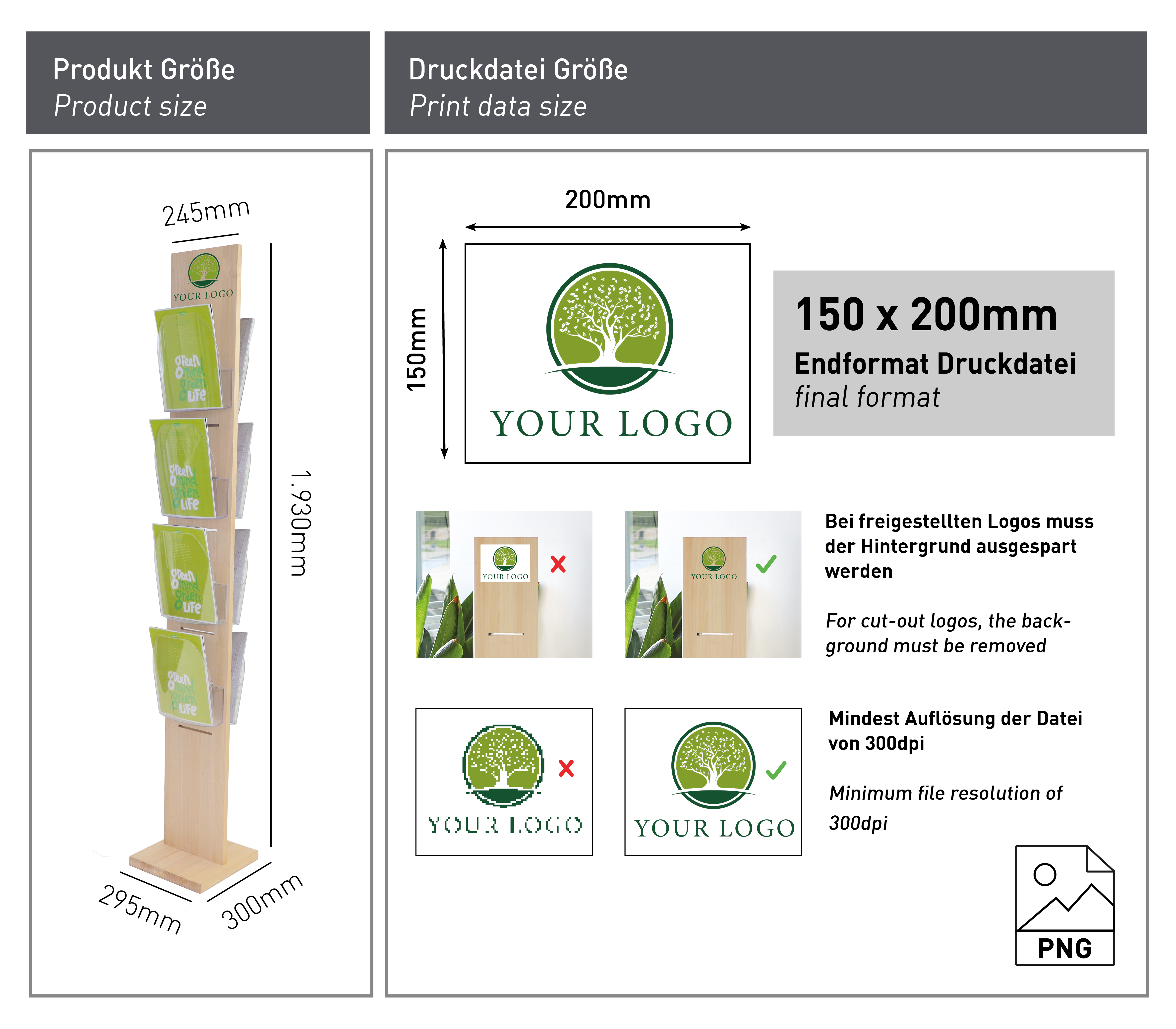 Wir bedrucken deinen Holz-Prospektständer ein- oder beidseitig mit deinem Layout im langlebigen Transferdruck.