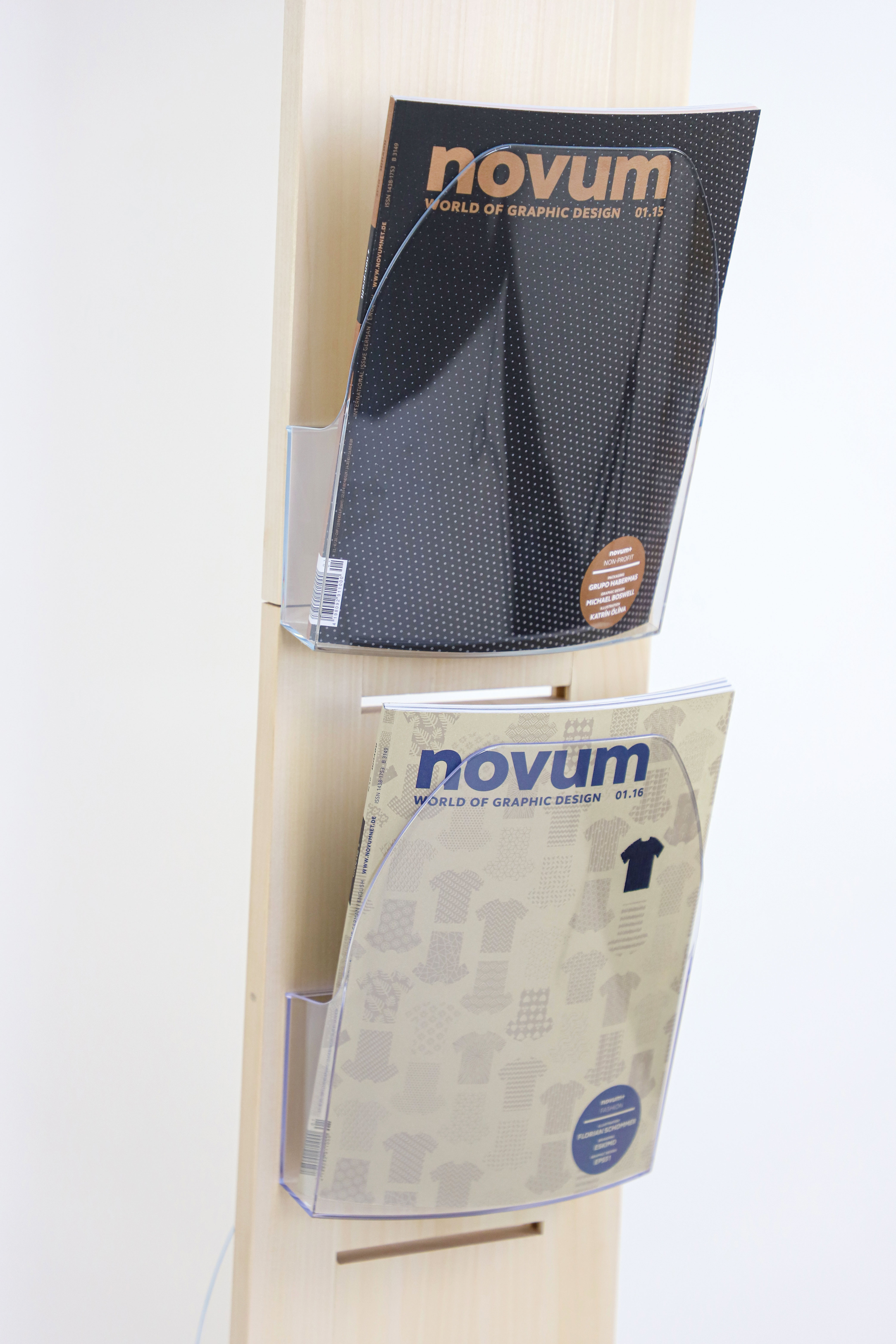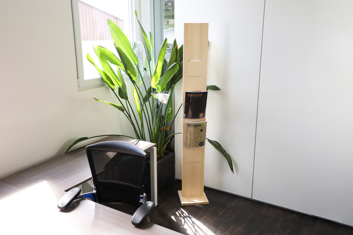 Gefertigt wird der freistehende Katalog-Ständer aus unbehandeltem, FSC-zertifiziertem Vollholz aus der Region Trentino-Südtirol.