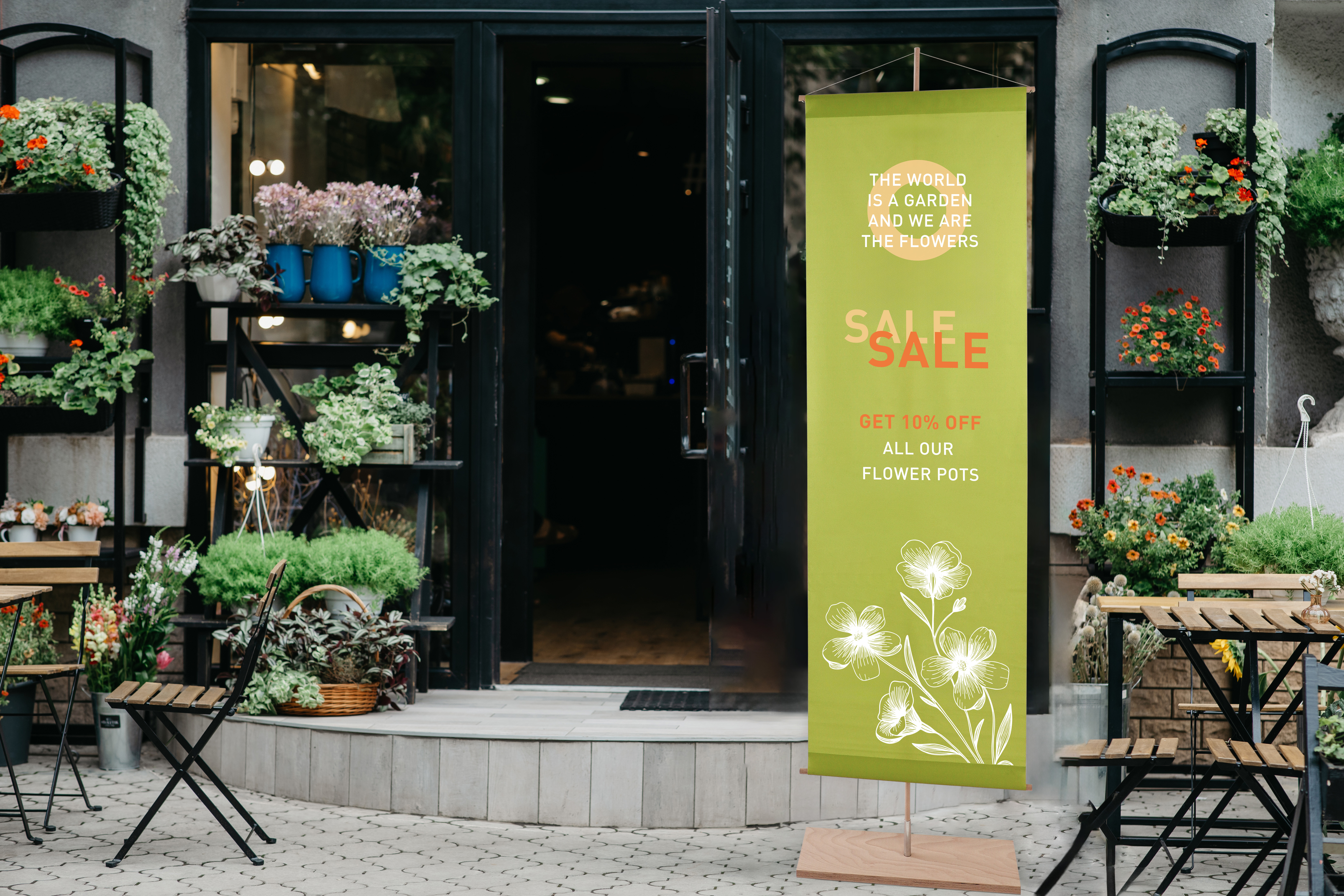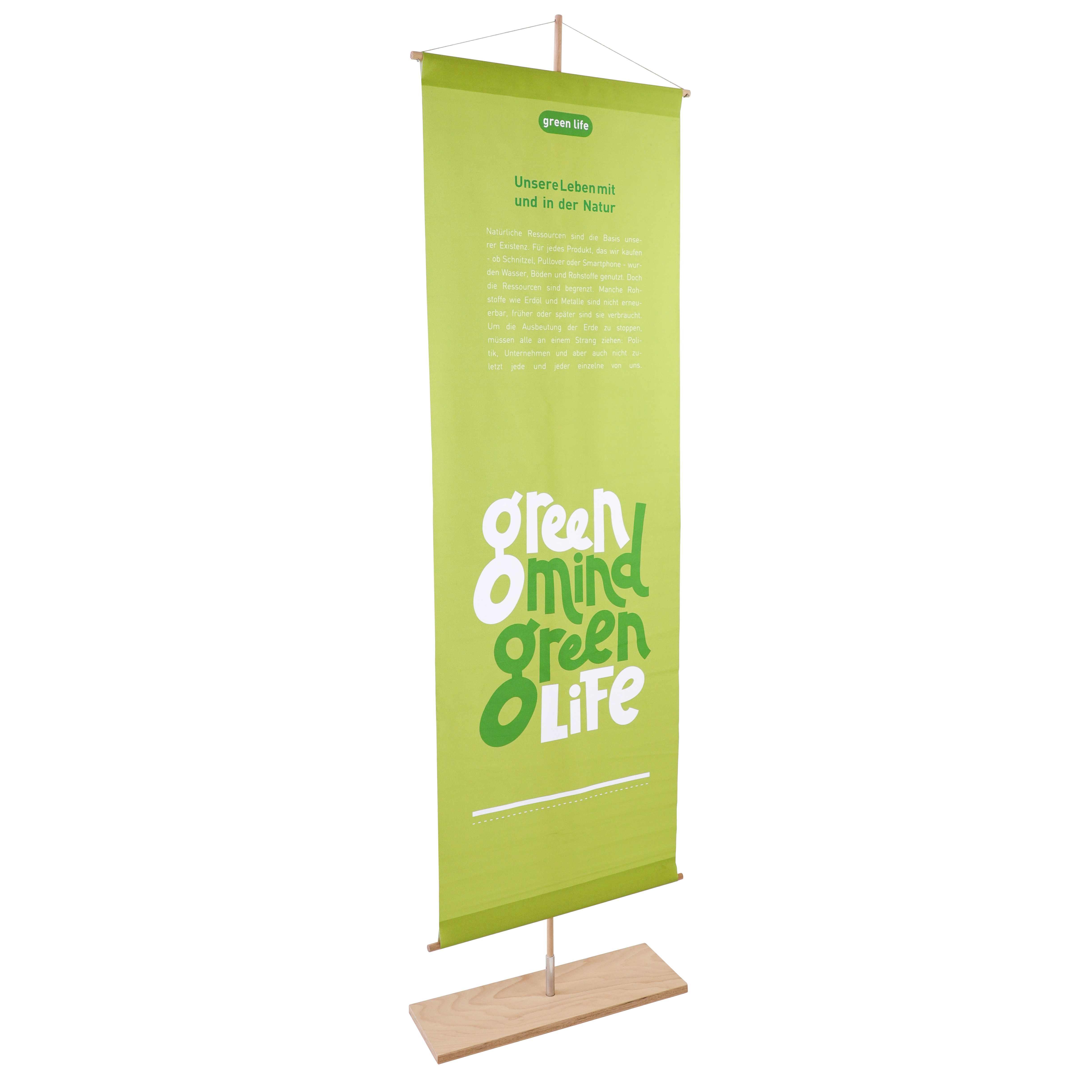 Gefertigt aus unbehandeltem Vollholz aus Europa, bringt dieser Aufsteller deine Werbebotschaft auf Fahne gedruckt stilvoll zur Geltung.