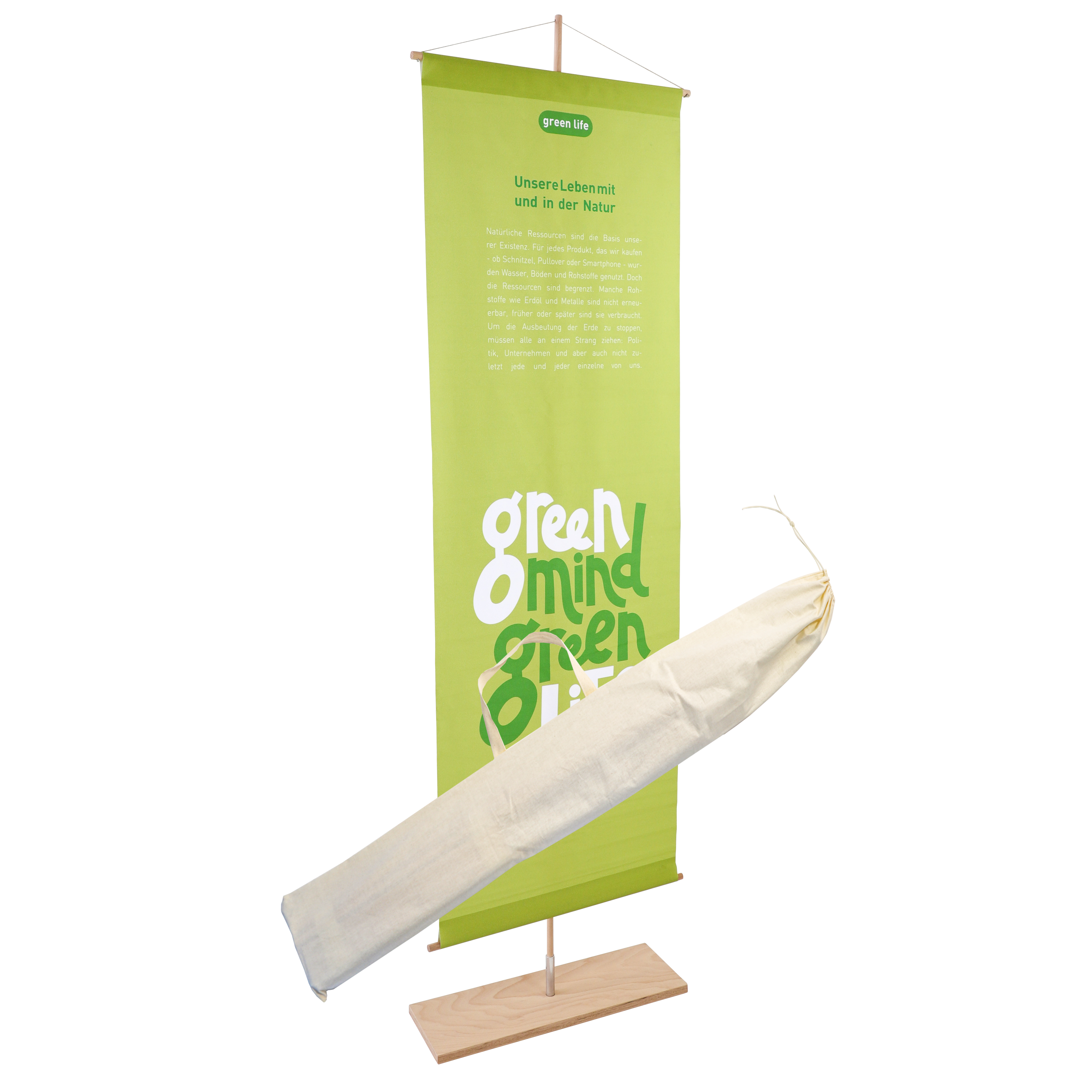 Gefertigt aus unbehandeltem Vollholz aus Europa, bringt dieser Aufsteller deine Werbebotschaft auf Fahne gedruckt stilvoll zur Geltung.